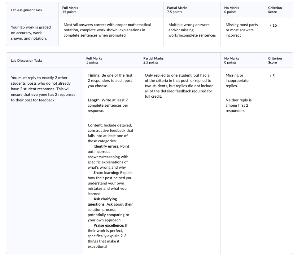 To implement this practice equitably, it is important to provide support and scaffolds for students who may be less familiar with peer review or online discussion norms. Clear rubrics, exemplar posts, and optional introductory modules on giving effective feedback can reduce anxiety and increase confidence for Black, Latine, Indigenous, and low-income students. Designing labs and prompts that connect calculus ideas to real-world or culturally relevant contexts can also help sustain engagement and support diverse learners. Providing flexibility in timelines and multiple ways to participate ensures that students balancing work, family, and schooling can still engage meaningfully.